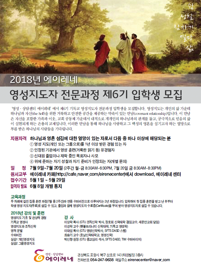 에이레네 영성상담센터에서 영성지도자 전문과정 입학생을 모집합니다. 에이레네는 영성지도자로 훈련받을 수 있는 기관입니다. 산책길 이강학 대표가 강사로 시작부터 참여해왔습니다. 자세한 내용은 포스터와 에이레네 웹사이트(https://cafe.naver.com/eirenecenter)를 참조하세요.