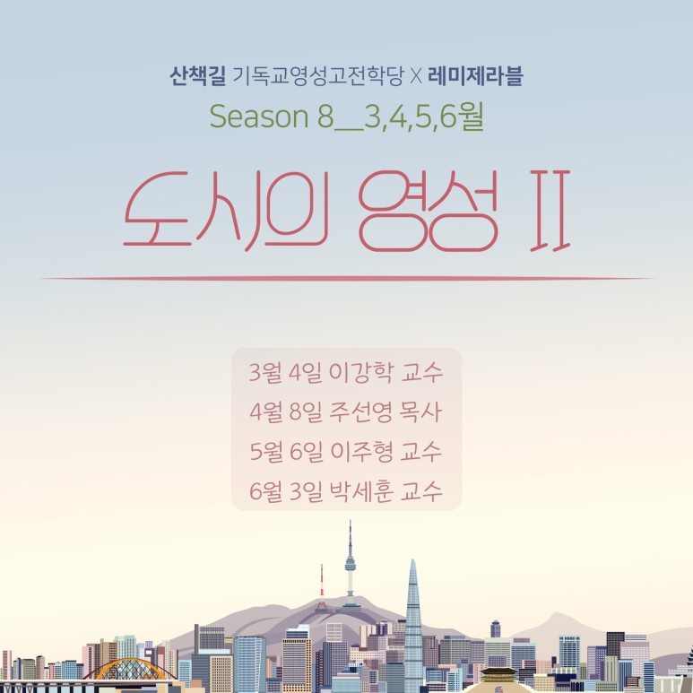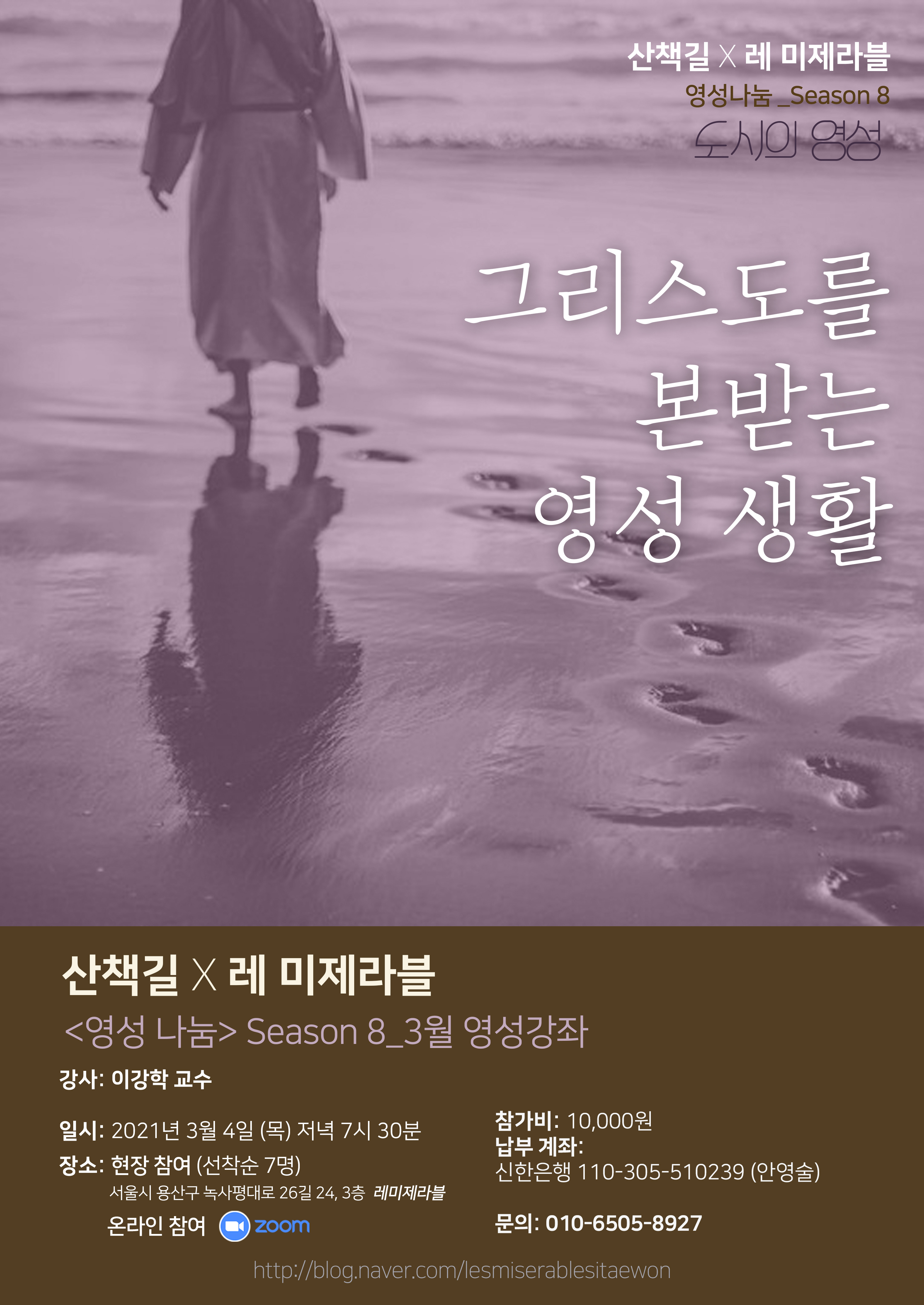 '산책길'과 '레 미제라블'이 함께 하는 <영성나눔> season 8이 봄과 함께 시작됩니다. 지난 시즌 7에 이어 '도시의 영성'이라는 주제 아래 매달 첫째(또는 둘째) 목요일 저녁에 온오프라인에서 만납니다. 자세한 내용은 포스터를 참조하세요.