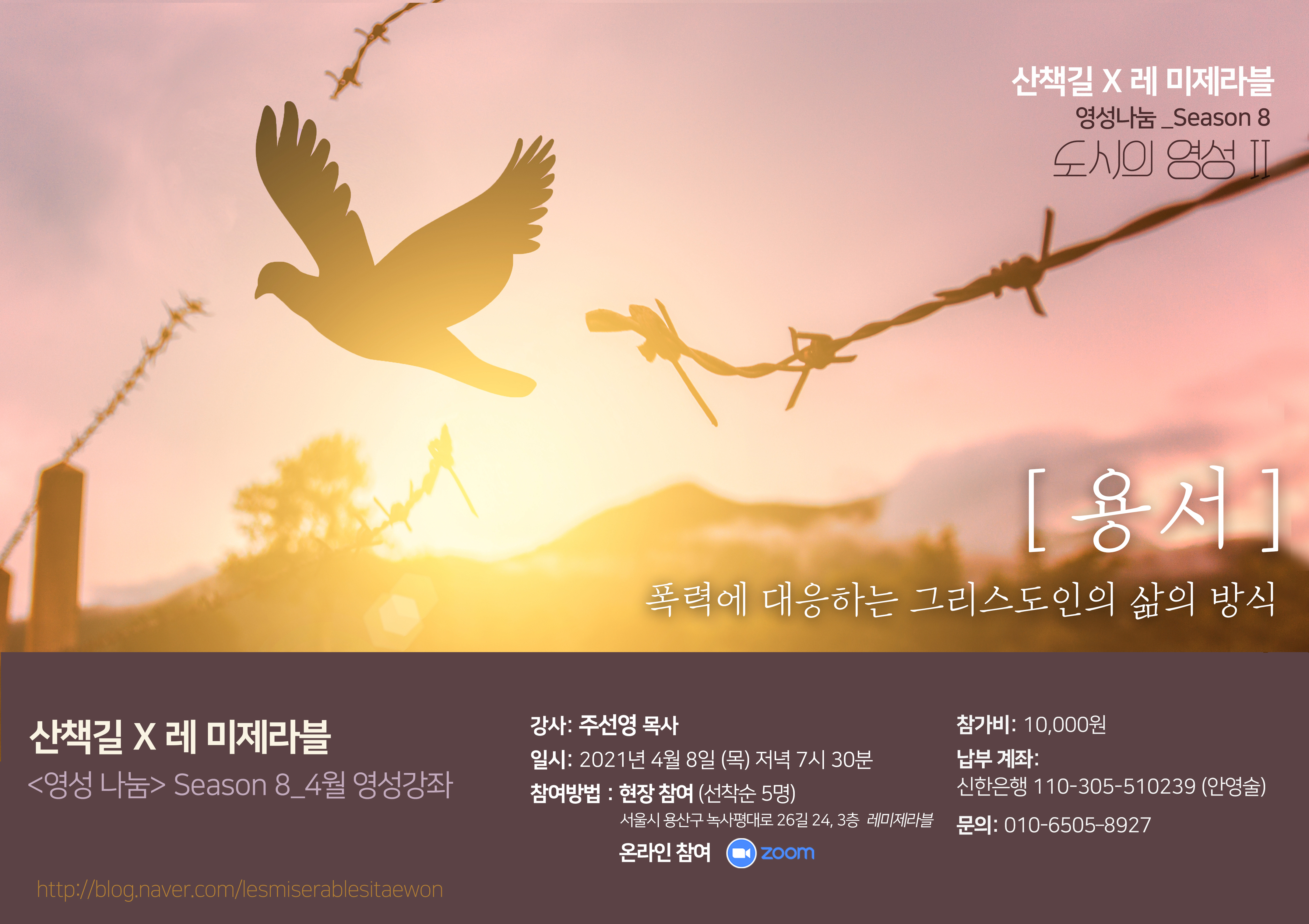 산책길 X 레 미제라블 〈영성나눔〉 시즌 8의 두 번째 강좌가 다음과 같이 열립니다. “도시의 영성”을 주제로 진행 중인 시즌 8, 두 번째 강좌는 "용서 : 폭력에 대응하는 그리스도인의 삶의 방식”입니다. 세상에 만연한 폭력에 그리스도인이 어떻게 대응해야 하는지를 함께 고민하는 시간이 될 것입니다. 자세한 내용은 레미제라블 블로그(클릭)를 참조해 주세요.