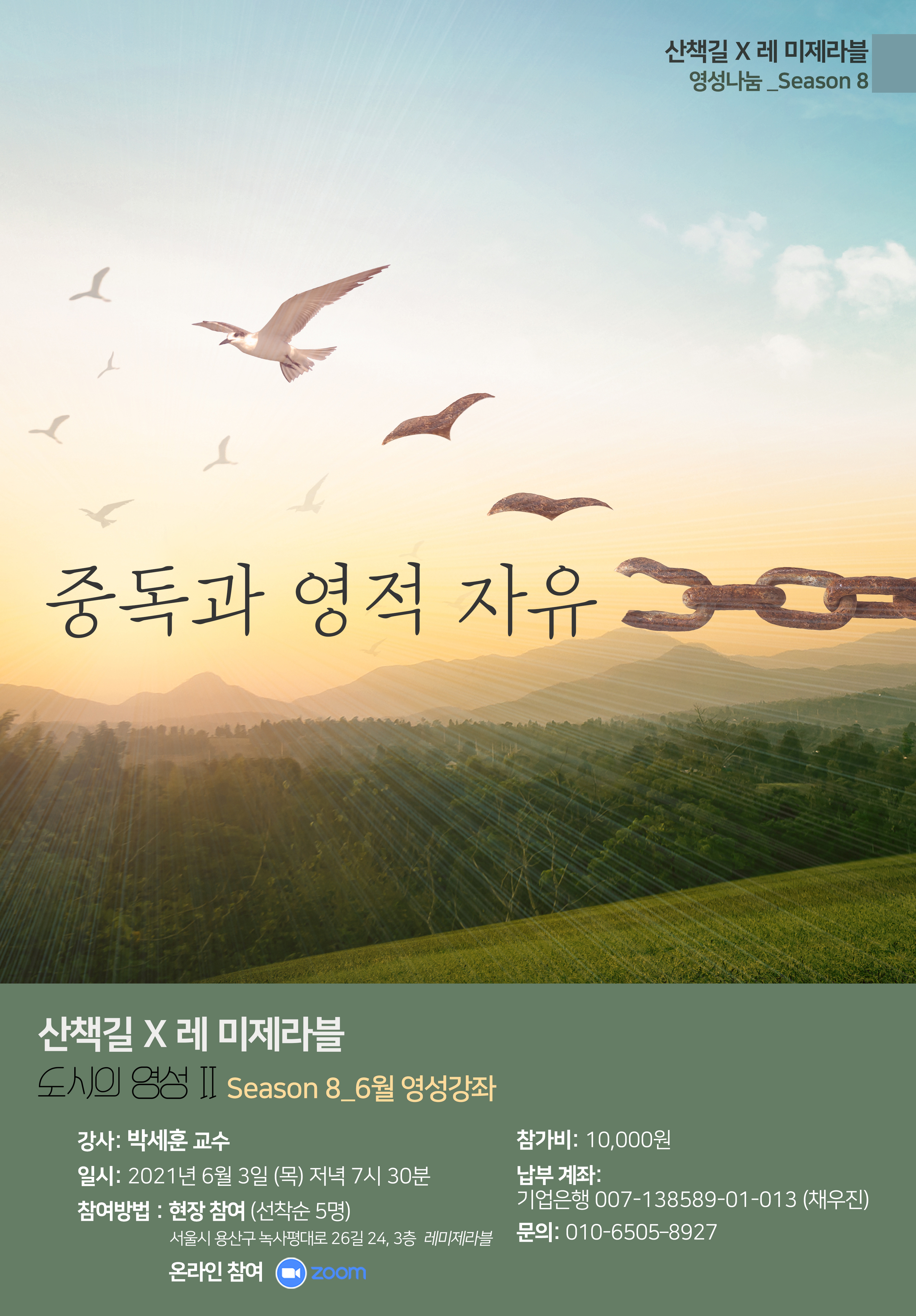 산책길 X 레 미제라블 〈영성나눔〉 시즌 8의 마지막 강좌가 다음과 같이 열립니다. “도시의 영성”을 주제로 진행 중인 시즌 8, 네 번째 강좌는 "중독과 영적 자유”입니다. 자세한 내용은 포스터와 레미제라블 블로그를 참조해 주세요.