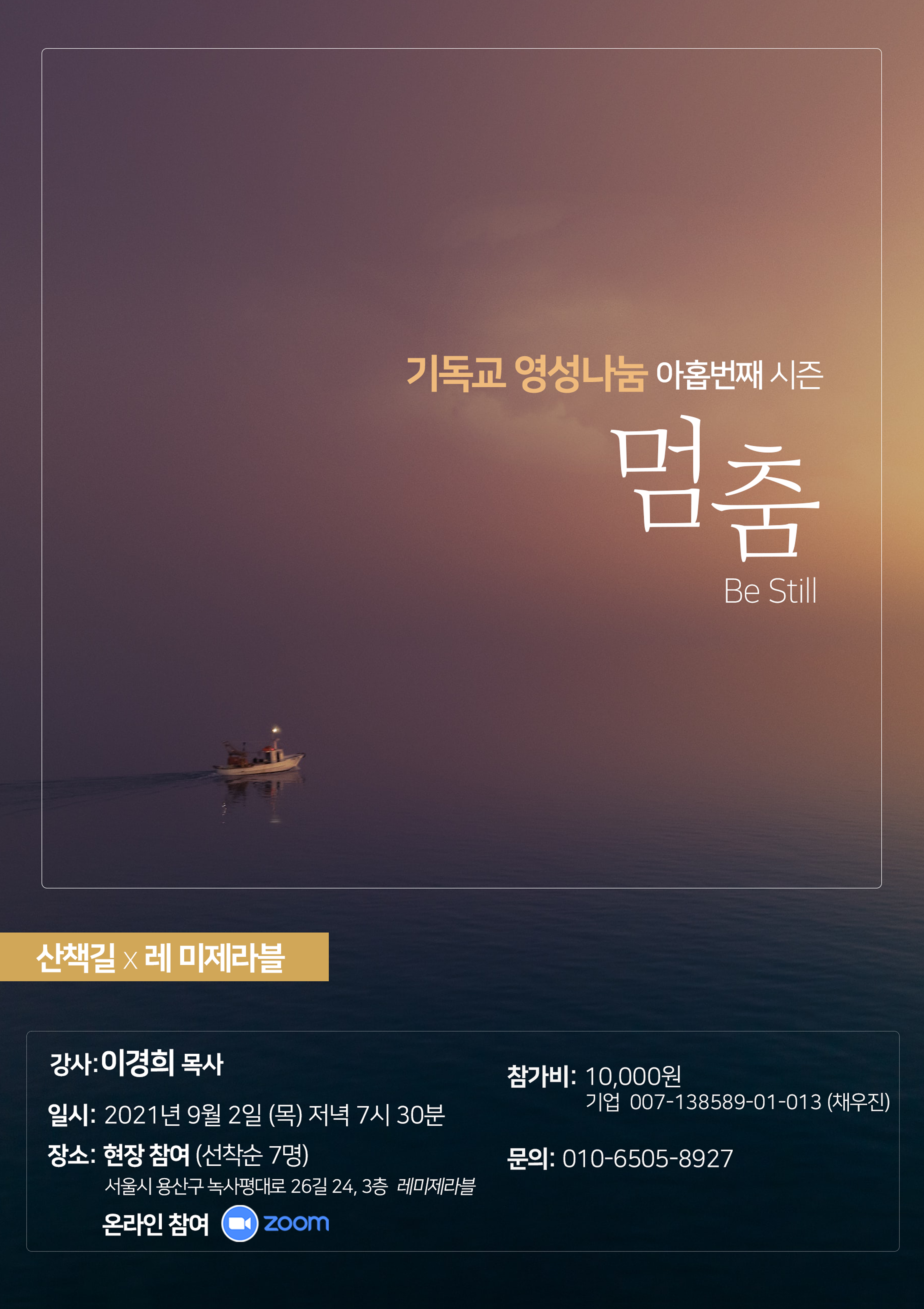 '산책길'과 '레 미제라블'이 함께 하는 영성나눔이 벌써 아홉 번째 시즌을 맞았습니다. 그 첫 번째 강좌가 아래와 같이 진행됩니다. 자세한 내용은 포스터와 레 미제라블 블로그(클릭)를 참조하시길 바랍니다.