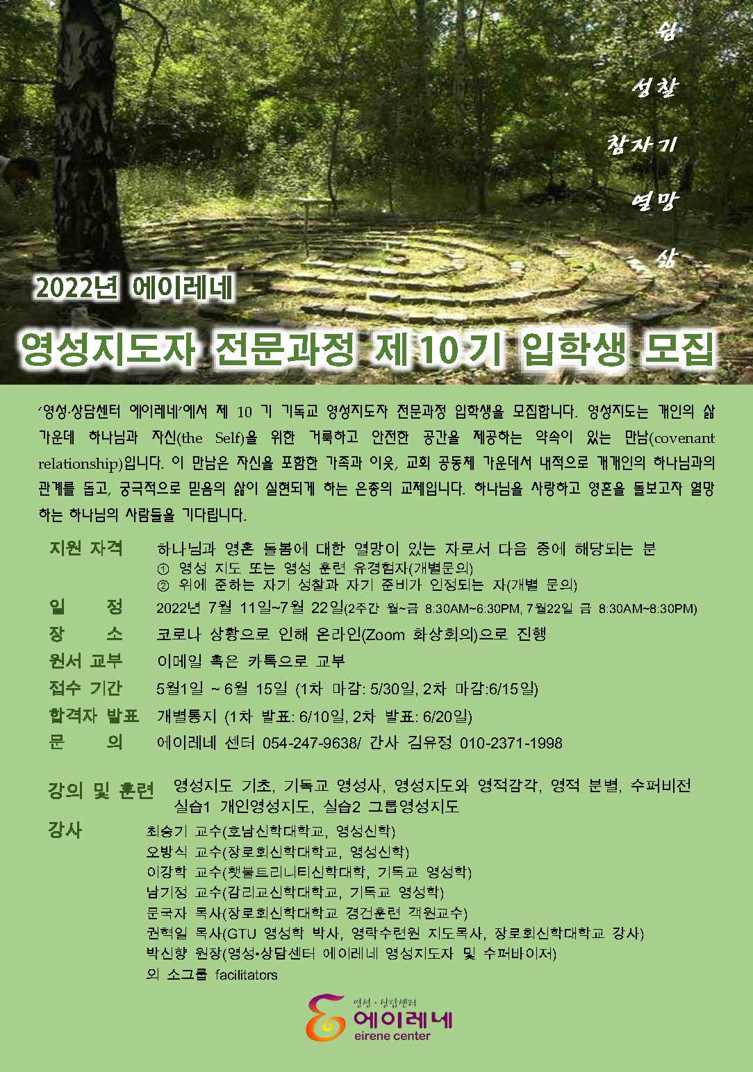 '에이레네 영성상담센터'에서 2022년 영성지도자 전문과정 입학생을 모집합니다. 에이레네는 영성지도자로 훈련받을 수 있는 신뢰할 수 있는 기관입니다. 산책길 이강학 대표와 남기정, 권혁일 연구원이 강사로 참여합니다. 자세한 내용은 포스터를 참조하세요.