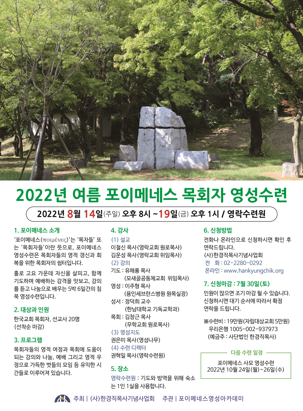 [영성 동네 소식] 목회자와 선교사님들을 위한 '2022년 여름 포이메네스 영성수련'이 아래와 같이 영락수련원에서 열립니다. 선착순으로 스무 분을 모십니다. 자세한 내용은 포스터를 참조하시길 바랍니다.