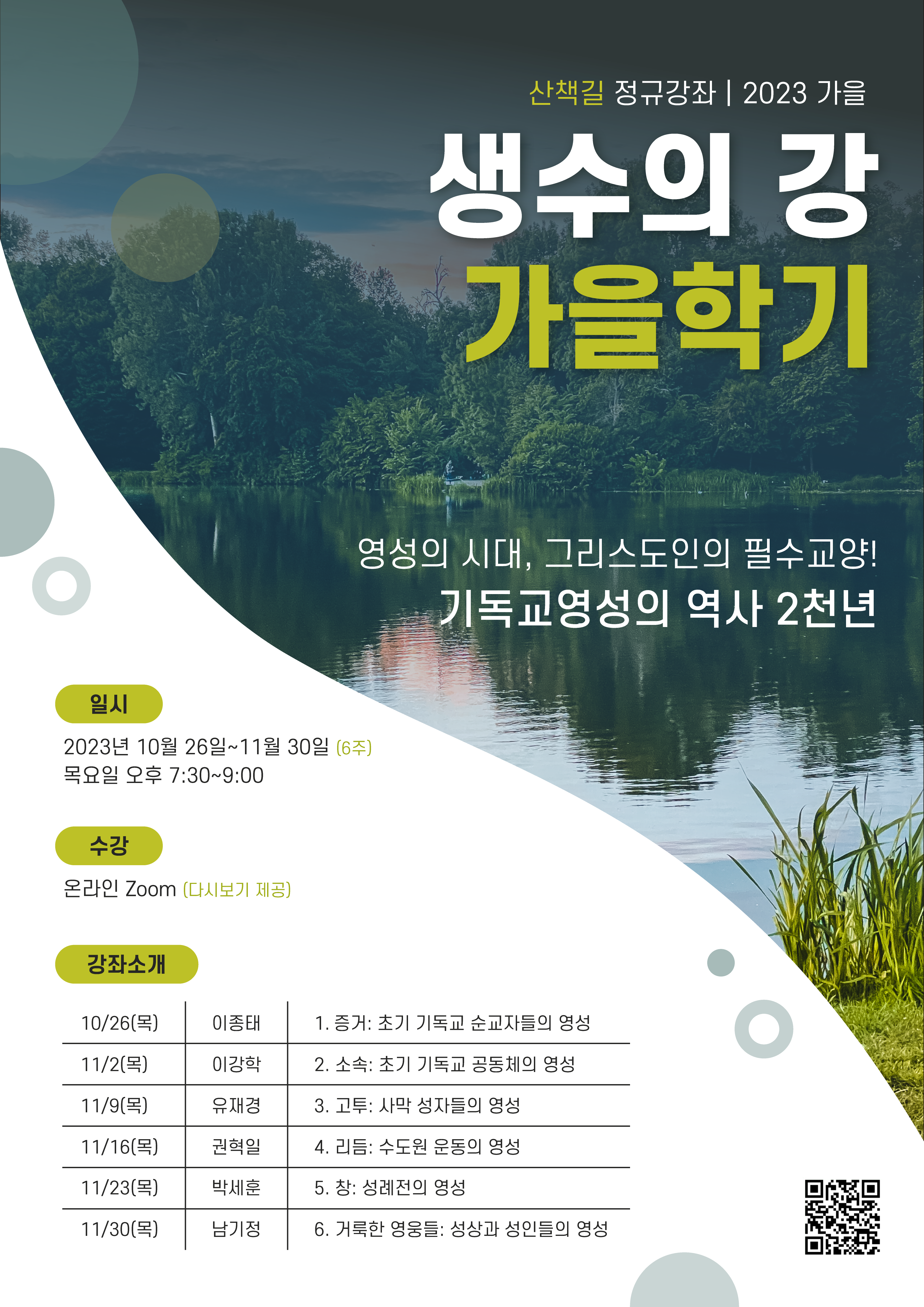 산책길에서 <생수의 강: 기독교영성의 역사 2쳔 년> 가을학기 강좌를 오픈합니다.