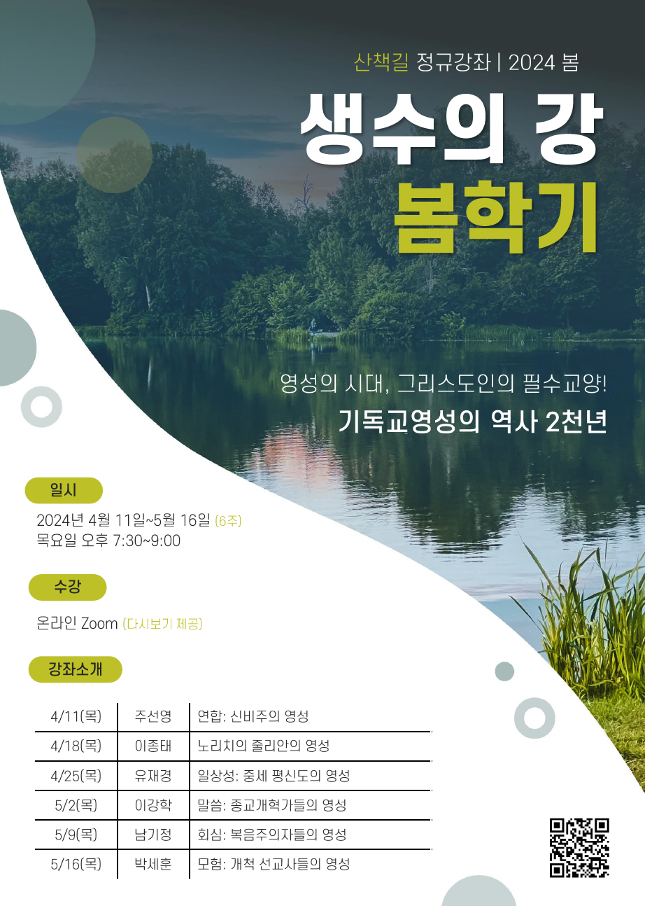 산책길에서 <생수의 강: 기독교영성의 역사 2쳔 년> 봄학기 강좌를 오픈합니다.
