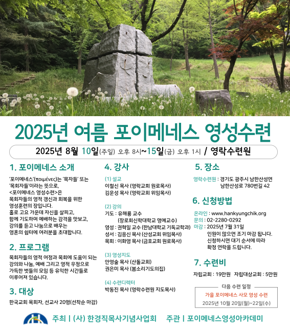 [영성 동네 소식] ‘2025년 여름 포이메네스 목회자 영성 수련’이 8월 10일(주일) 저녁부터 15일(금) 낮까지 남한산성에 위치한 영락수련원에서 열립니다. 늘 바쁜 사역으로 인해 말씀을 깊이 묵상하고 기도할 수 있는 시간을 잘 내지 못하는 목회자들을 위한 좋은 기회입니다. 산책길 권혁일 목사가 강사로 참여합니다. 자세한 내용은 포스터를 참조해 주세요.